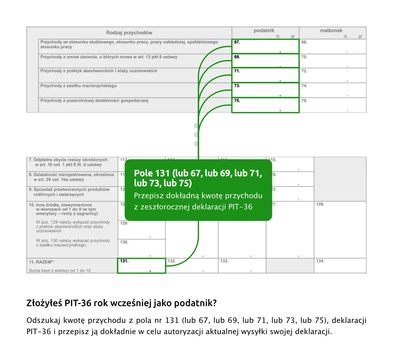 Jeśli składałeś w zeszłym roku np. PIT-37, a w tym roku składasz PIT-36, to należy wziąć kwotę przychodu ze złożonego w zeszłym roku z PIT-37.