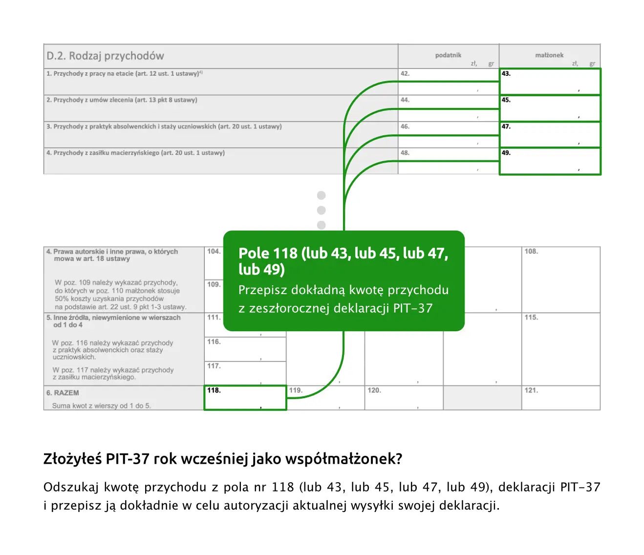 Jeśli w zeszłym roku ten podatnik był wpisany jako małżonek - należy oczywiście wpisać dane przychodu z sekcji małżonka.