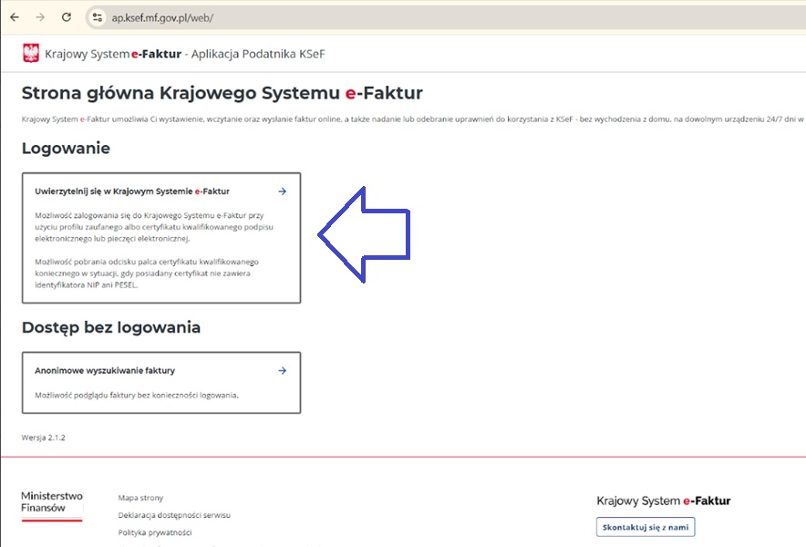 W sekcji ‘Logowanie’ należy wybrać opcję ‘Uwierzytelnij się w Krajowym Systemie e-Faktur’.