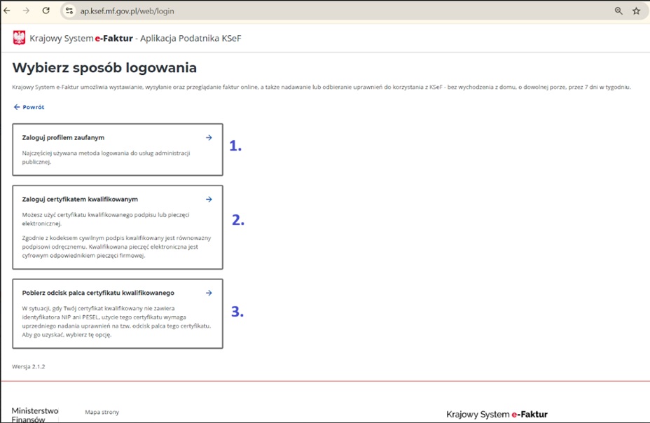 W celu uzyskania dostępu do KSeF nadania w nim uprawnień, wygenerowania tokena lub certyfikatu do uwierzytelnienia i trwałego połączenia z systemem KSeF lub certyfikatu do wystawiania e-faktur w trybie offline, należy zalogować się do Aplikacji Podatnika KSeF na stronie https://ap.ksef.mf.gov.pl/web/.