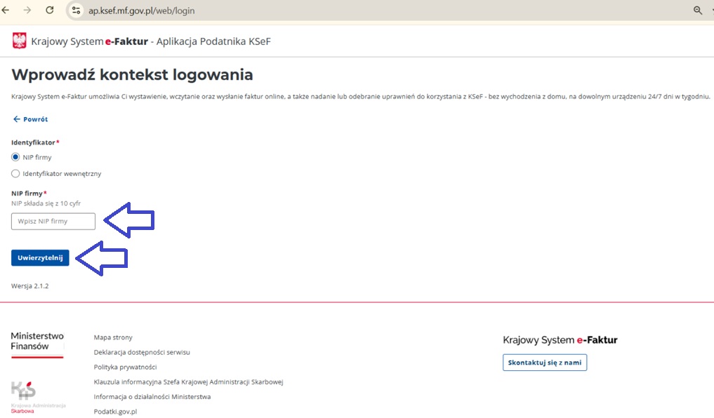 W sekcji ‘Wprowadź kontekst logowania’ należy wpisać NIP swojej firmy, a następnie wybrać przycisk ‘Uwierzytelnij’.