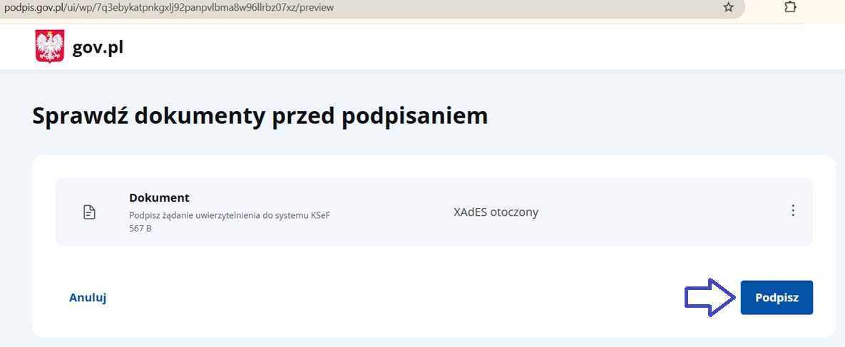 Wyświetli się okno podpisywania dokumentu żądania uwierzytelnienia, w którym można sprawdzić dokumenty przed podpisaniem, po czym należy kliknąć ‘Podpisz’.