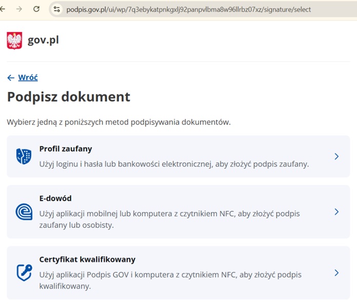 W kolejnym kroku można będzie wybrać metodę podpisu dokumentu: przez Profil zaufany, E-dowód lub Certyfikat kwalifikowany.