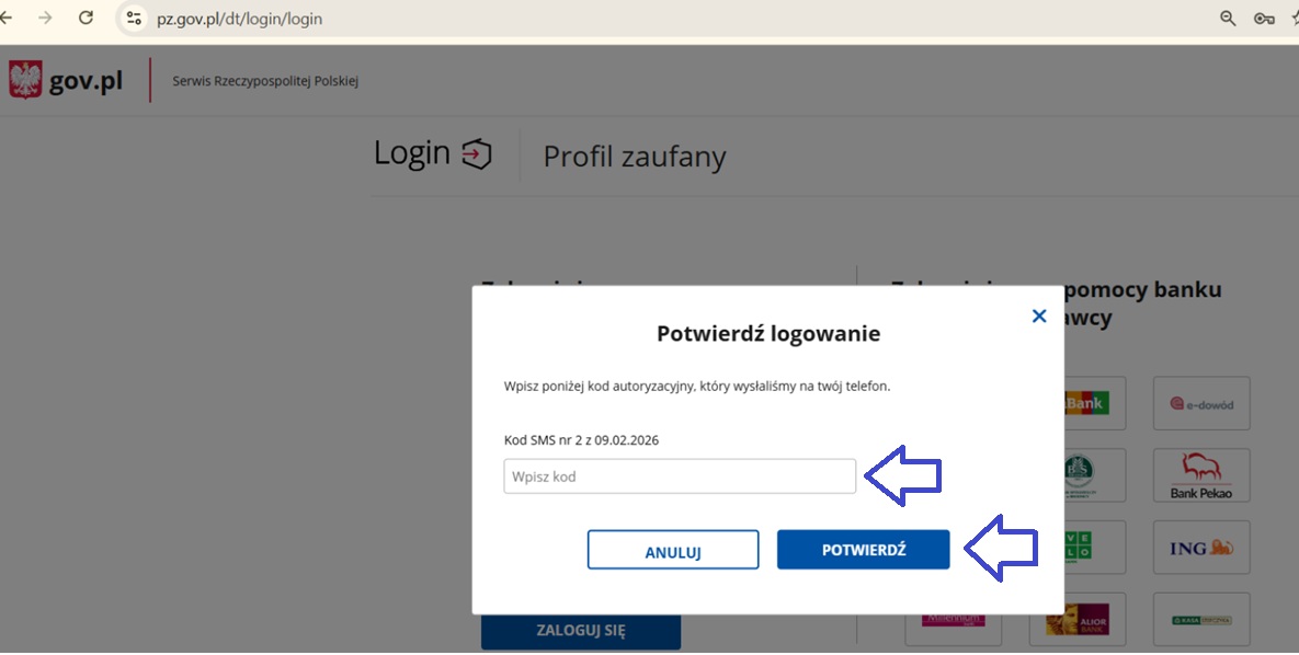 Po wpisaniu danych do logowania, musimy je potwierdzić wpisując kod SMS. Po wpisaniu kodu, klikamy 'Potwierdź'.