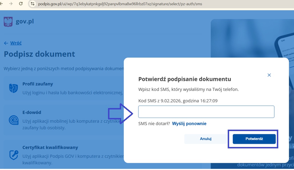 Następnie potwierdzamy podpisanie dokumentu - wpisujemy kod SMS i klikamy ‘Potwierdź’.