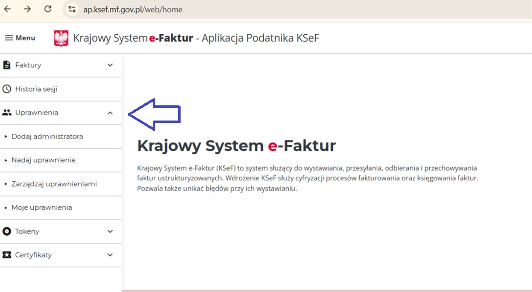 Chcąc sprawdzić i nadać uprawnienia do systemu KSeF, należy najpierw zalogować się do Aplikacji Podatnika KSeF https://ap.ksef.mf.gov.pl/web/.