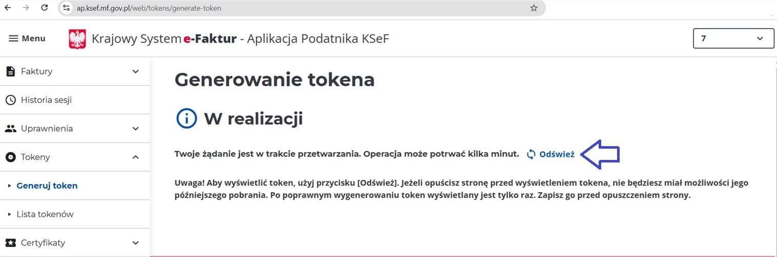 Pokaże nam się komunikat, że generowanie tokena jest w trakcie realizacji. Chcąc zobaczyć wygenerowany token, wybieramy ‘Odśwież’.