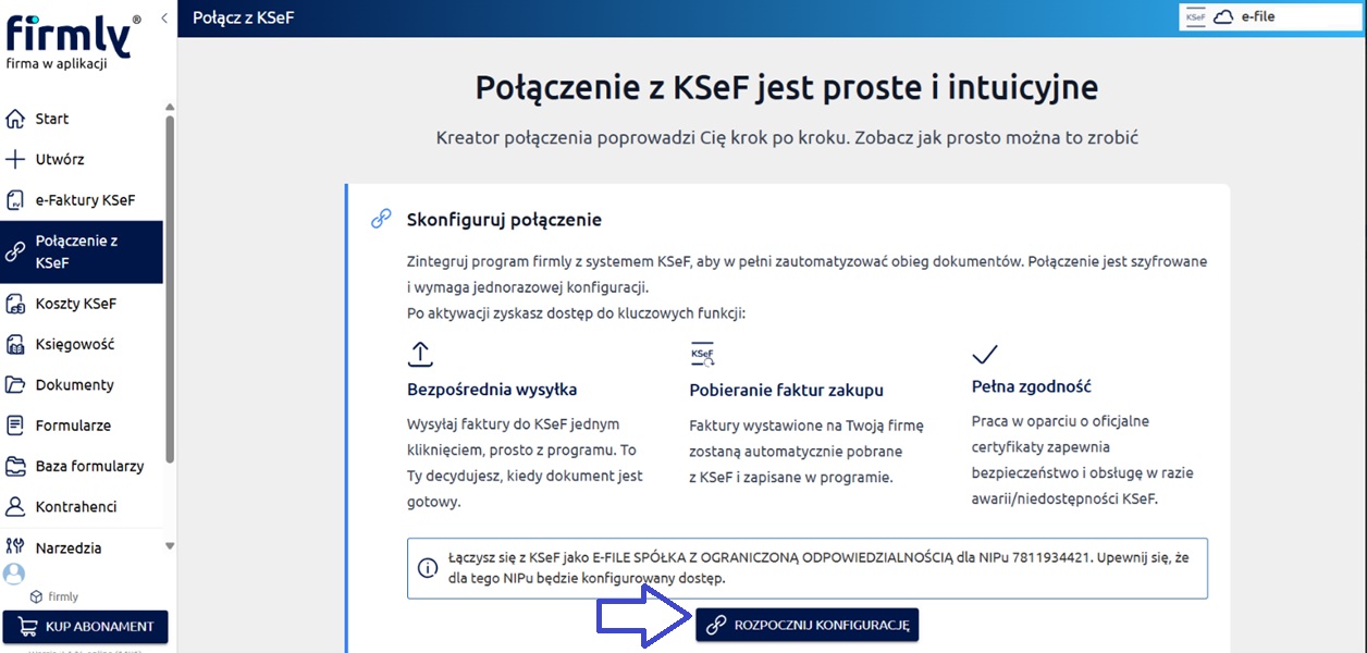 Chcąc połączyć się w aplikacji firmly z systemem KSeF przez token, wybieramy z bocznego menu ‘Połączenie z KSeF’, a następnie ‘Rozpocznij konfigurację’.