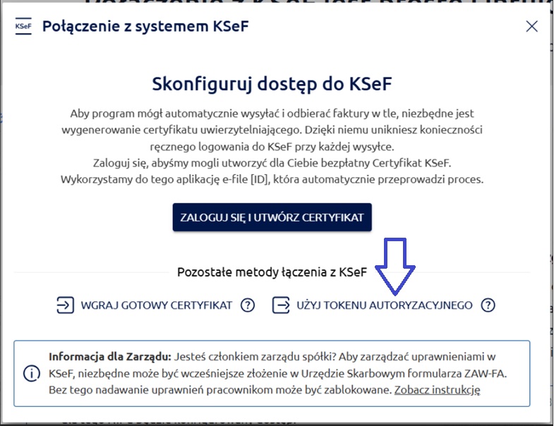 Dlatego zalecamy ustawienie w aplikacji firmly trwałego połączenia z systemem KSeF poprzez wgranie certyfikatu do uwierzytelnienia w KSeF i certyfikatu do wystawiania faktur w trybie offline - na wypadek awarii systemu KSeF.