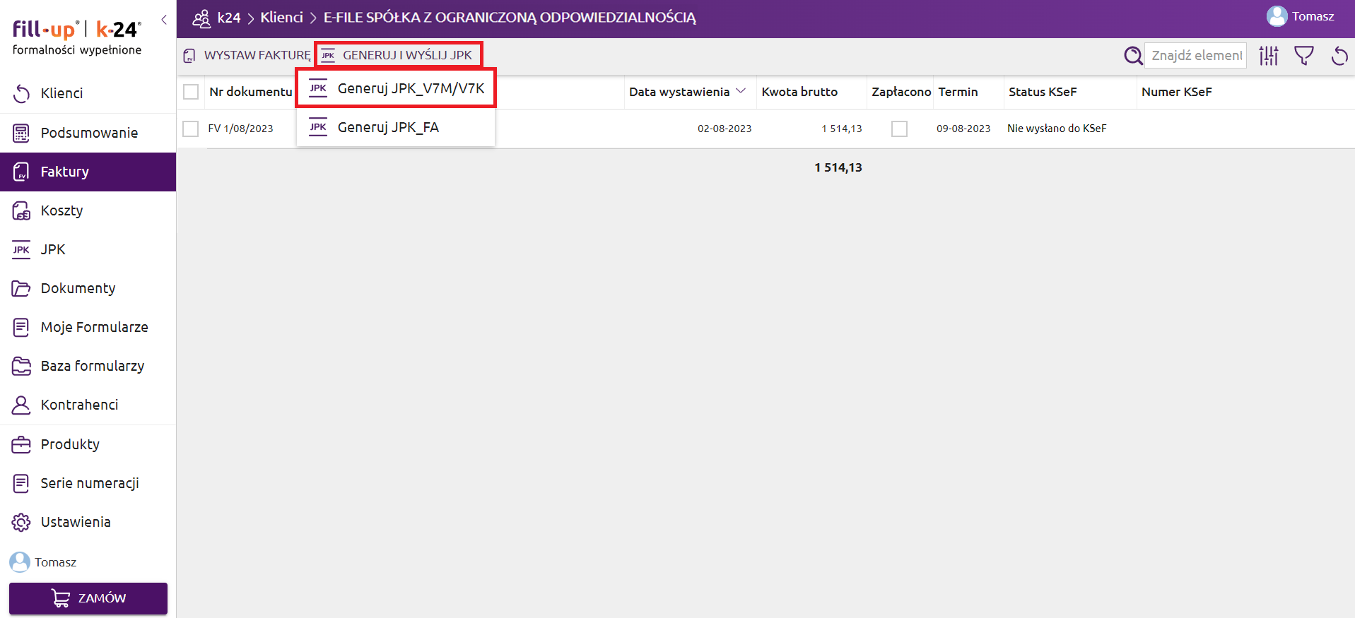 Aby uruchomić kreator wysyłki JPK_V7M / JPK_V7K, należy kliknąć w przycisk 'Generuj i wyślij JPK', a następnie w przycisk 'Generuj JPK_V7M/V7K'.