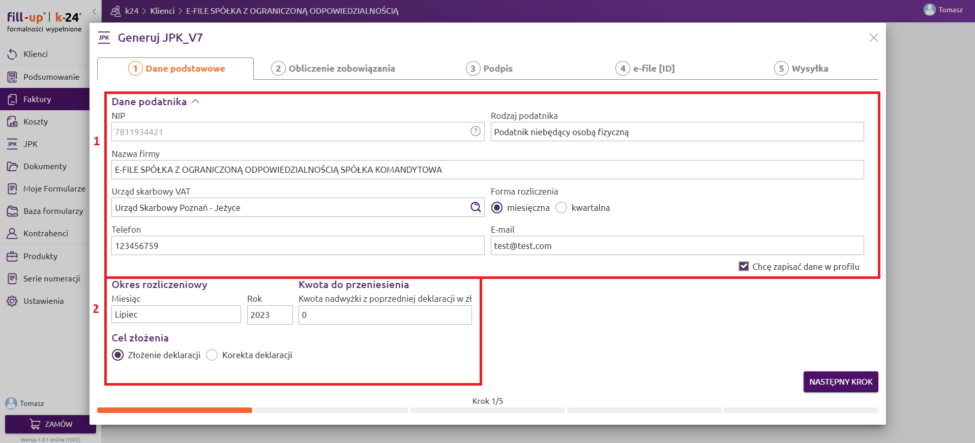 W pierwszym kroku kreatora wysyłki uzupełniamy dane podatnika (1). Wypełniamy odpowiednie pola wpisując ręcznie dane podatnika, dla którego ma zostać wystawiony plik JPK_V7M/JPK_V7K. Jeśli wcześniej zapisaliśmy dane w profilu, to kreator sam wczyta wszystkie nasze dane.