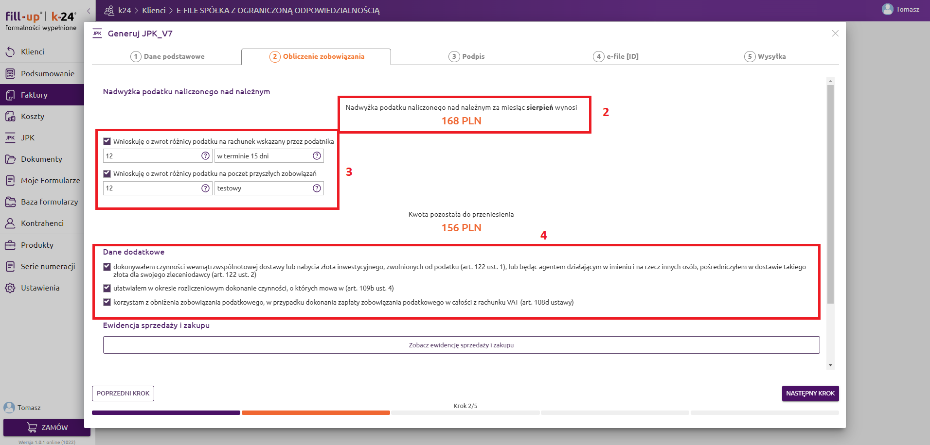 Drugi krok kreatora JPK_V7M oraz ostatniego miesiąca kwartału JPK_V7K przedstawia wartość podatku należnego za dany miesiąc (1) lub nadwyżkę podatku naliczonego nad należnym (2). W drugim przypadku możemy wnioskować o zwrot różnicy podatku na rachunek wskazany przez podatnika oraz o zwrot różnicy podatku na poczet przyszłych zobowiązań (3). W kolejnej sekcji należy zaznaczyć odpowiednie dane dodatkowe zgodne ze stanem faktycznym (4).