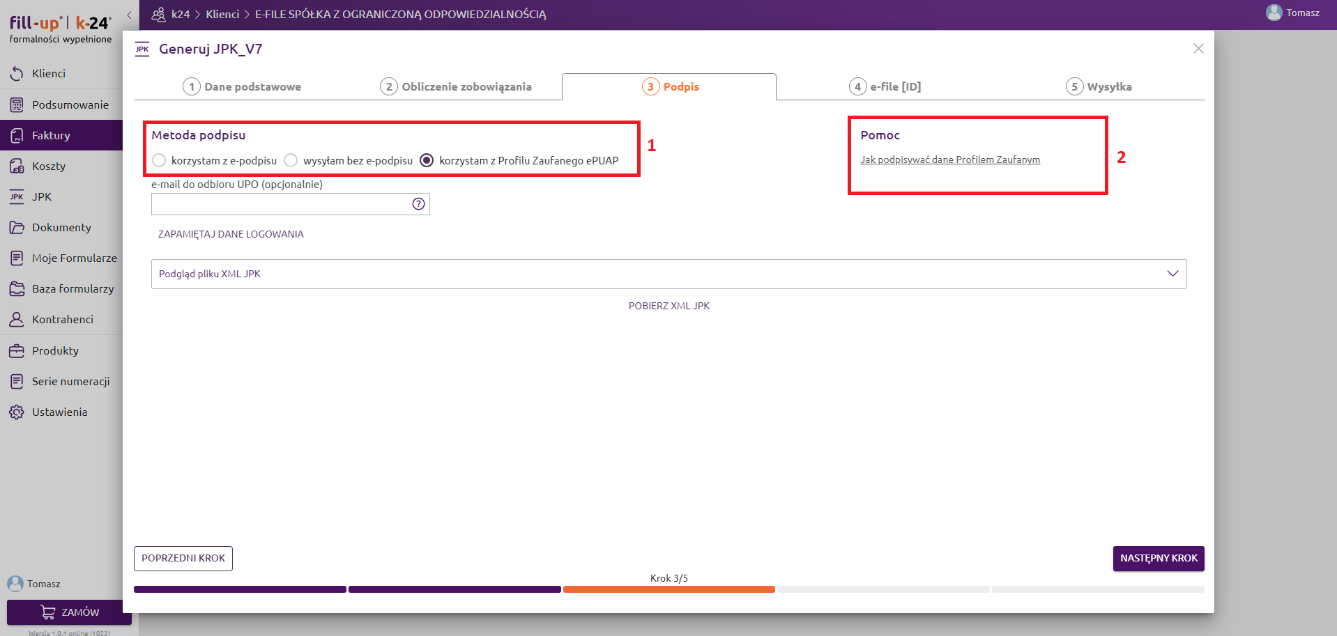 W kreatorze wysyłki plików JPK na urządzeniach mobilnych oraz z systemami MacOS i Linux można podpisać plik tylko kwotą przychodu za rok poprzedni. Podpisywanie pliku za pomocą Profilu Zaufanego e-PUAP lub podpisu kwalifikowanego jest obecnie możliwe tylko na komputerach z systemem Windows.