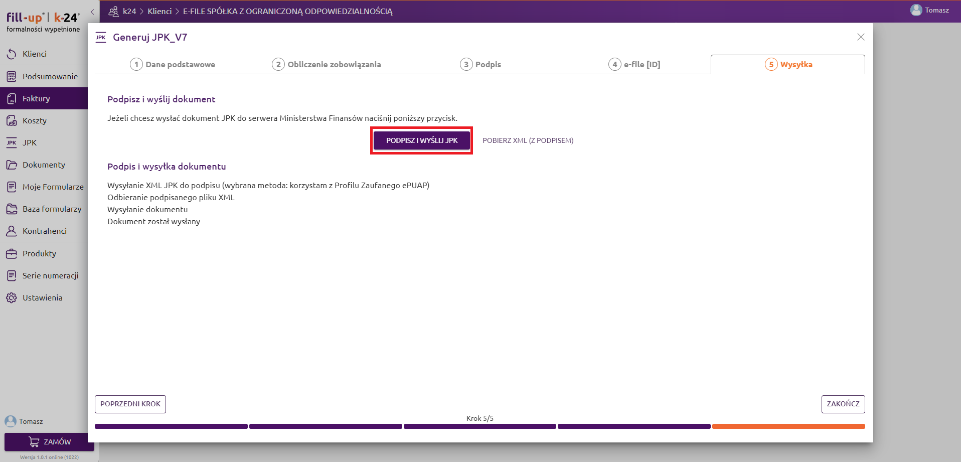 W tym kroku można podpisać i wysłać plik JPK. Po kliknięciu 'Podpisz i wyślij JPK' kreator przejdzie przez kolejne kroki podpisu, a po podpisaniu dokumentu - wyśle plik na serwery Ministerstwa Finansów.