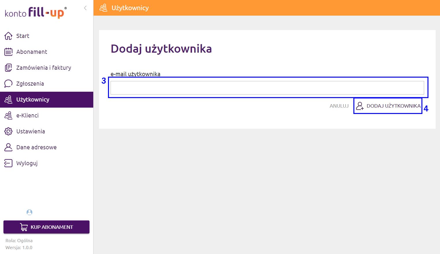 Następnie należy podać adres e-mail użytkownika (3), który ma być zaproszony i kliknąć 'Dodaj użytkownika' (4).