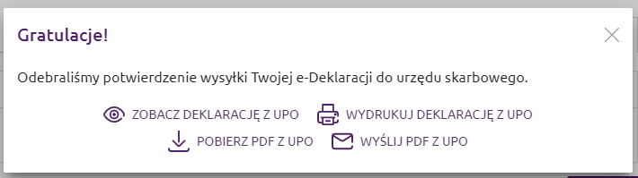 Po wysłaniu deklaracji pojawi się okno, w którym można zobaczyć wysłaną deklarację z UPO, wydrukować deklarację z UPO, pobrać PDF z UPO oraz wysłać PD deklaracji z UPO.