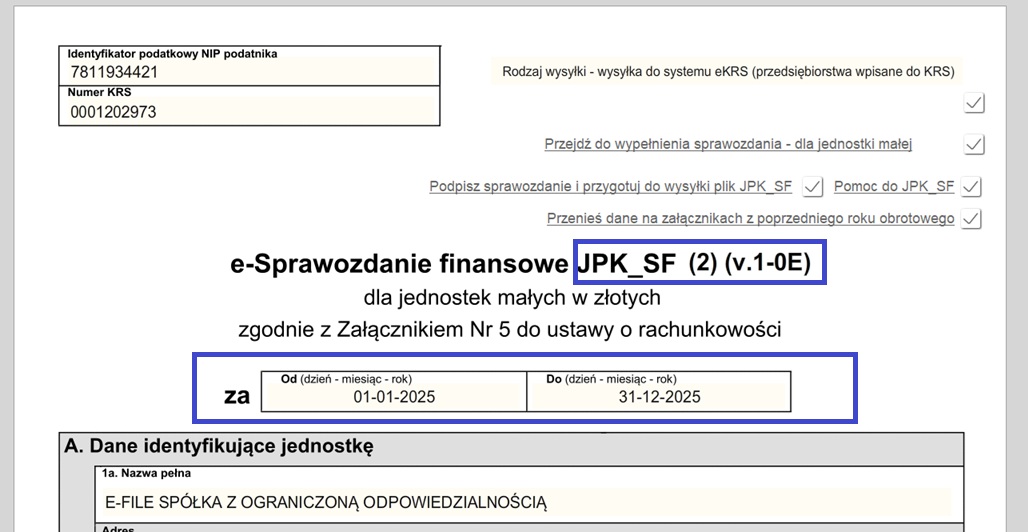 Dla sprawozdań, których okres obrachunkowy rozpoczął się 1.01.2025 r. lub później, można w Programie fillup wypełninić sprawozdanie w nowym wariancie (2) (v.1-0E). Nowe wersje e-Sprawozdań Finansowych w wariancie (2) dostępne są od wersji 8.4.0 programu fillup w zakładce e-Sprawozdania Finansowe.