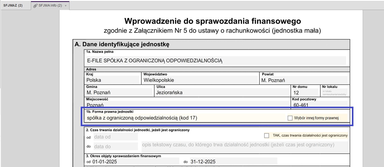W załączniku ‘Wprowadzenie do sprawozdania Finansowego’ będzie można podać dodatkowe informacje dotyczące firmy. Wypełnij pole Formy prawnej jednostki. Jeśli chcesz wpisać swój rodzaj formy prawnej, zaznacz checkbox ‘Wybór formy prawnej’ i wpisz samodzielnie informację.