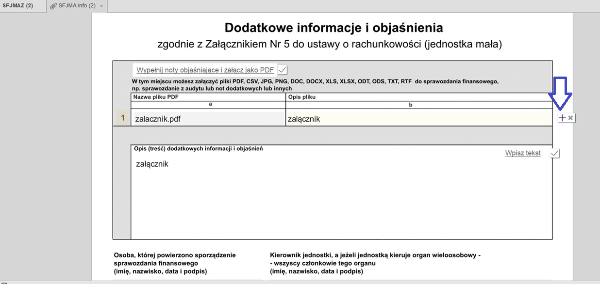 Jeśli potrzebujesz uszczegółowić niektóre wiersze w bilansie, to na ostatniej stronie formularza możesz dodać pozycje uszczegóławiające w tabeli ‘Dodatkowe pozycje uszczegóławiające wybierając przycisk z ikoną plusa po prawej stronie.