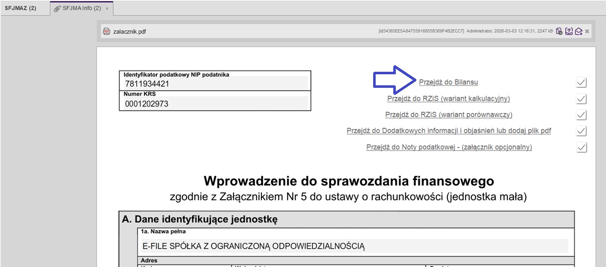 Chcąc wrócić do ‘Wprowadzenia do sprawozdania’, kliknij w zakładkę SFJMA info (2).