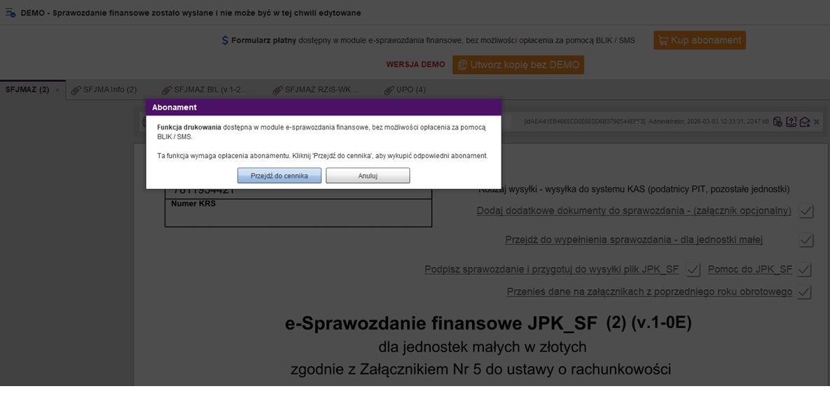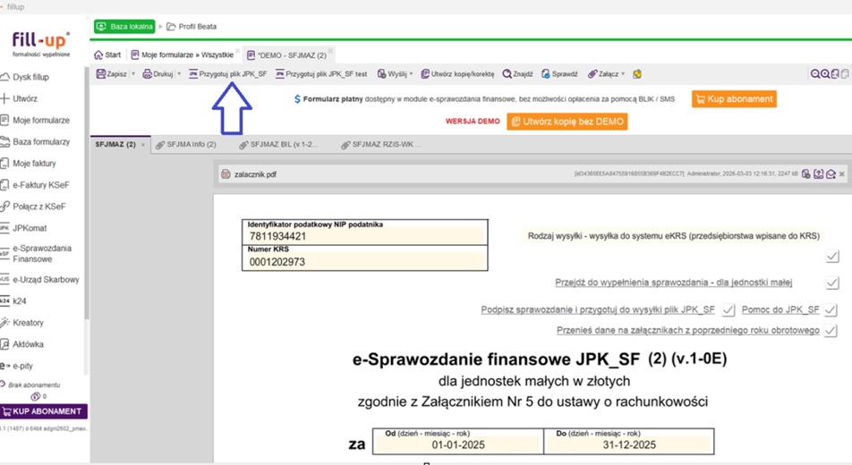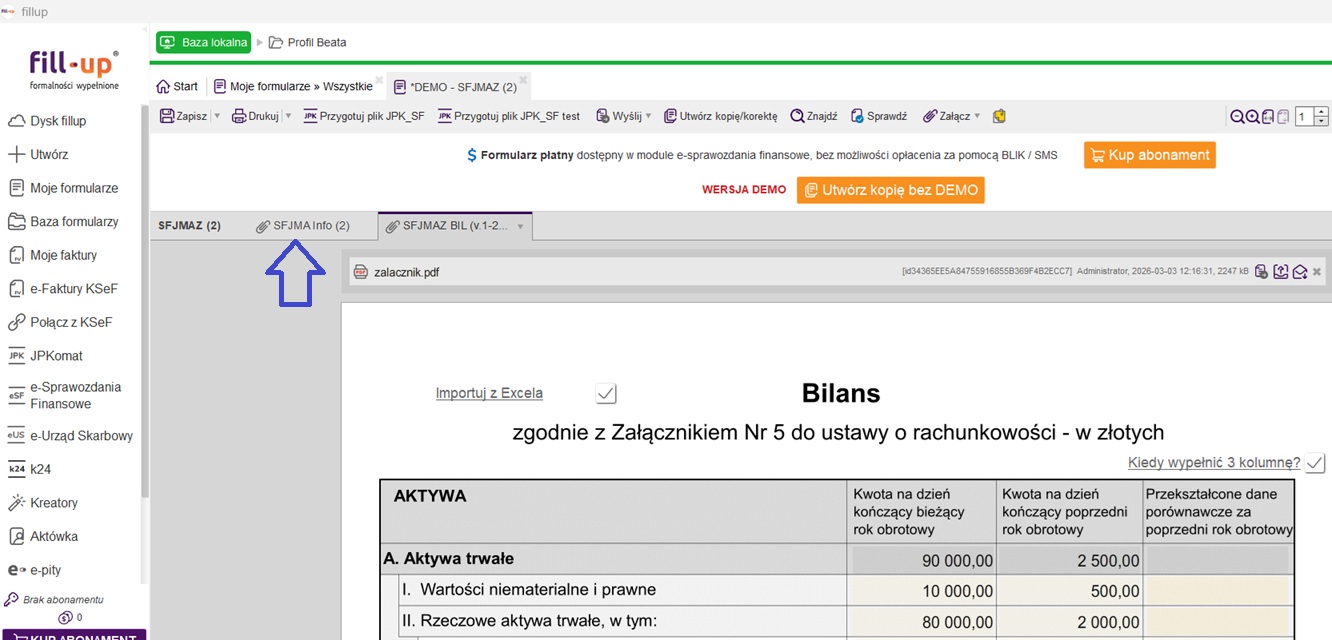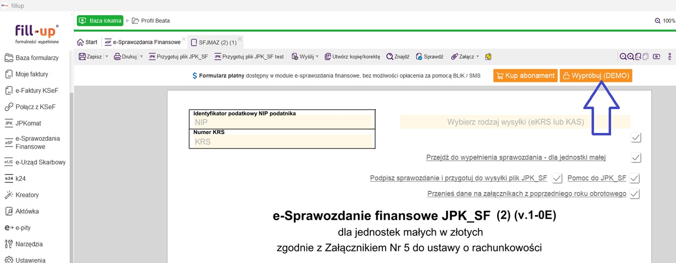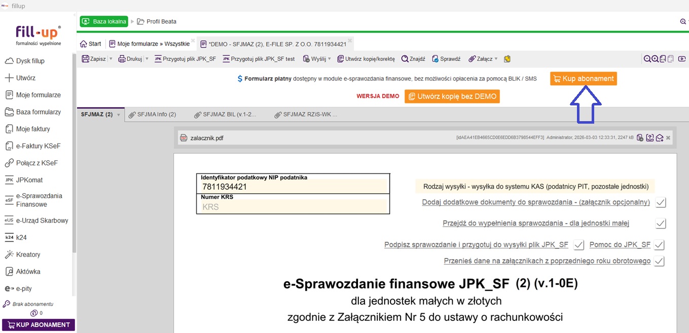 Zablokowane w wersji DEMO funkcjonalności zostaną automatycznie w programie odblokowane, w momencie, gdy w programie zostanie wprowadzony zakupiony abonament na sprawozdania finansowe. Można w tym celu wykupić abonament na sam moduł eSF na stronie fillup.pl, w zakładce cennik: ‘e‑SF Sprawozdania Finansowe’ lub Pakiet e-SF + formularze bazowe w cenniku w zakładce ‘taniej w pakiecie z e‑SF’.