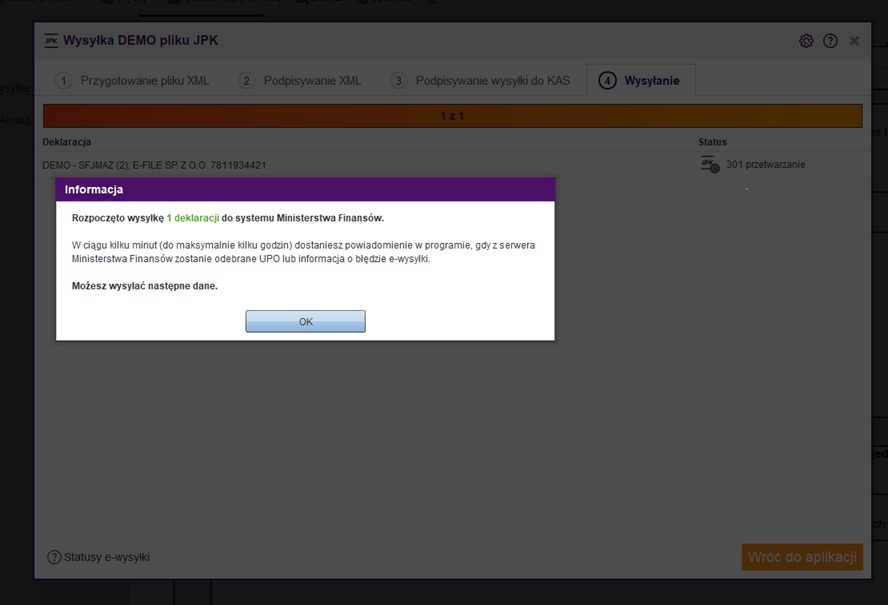 Aby rozpocząć wysyłkę testową, kliknij przycisk ‘Wyślij do KAS’. Program poinformuje nas o rozpoczęciu wysyłki testowej.