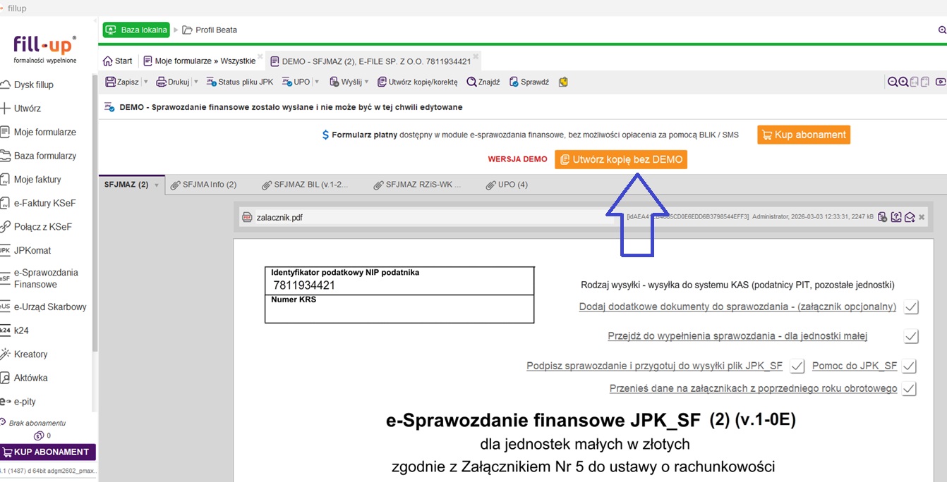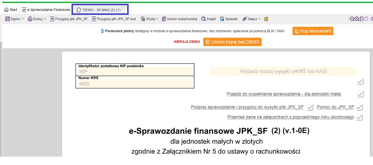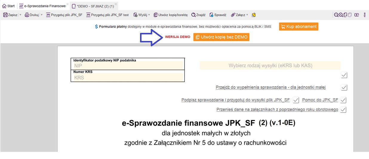 Po przetestowaniu sprawozdania na wersji demonstracyjnej, możesz szybko wyjść z DEMO, formularza klikając opcję ‘Utwórz kopię bez DEMO’ a następnie dostarczyć go do systemu KAS lub e-KRS.