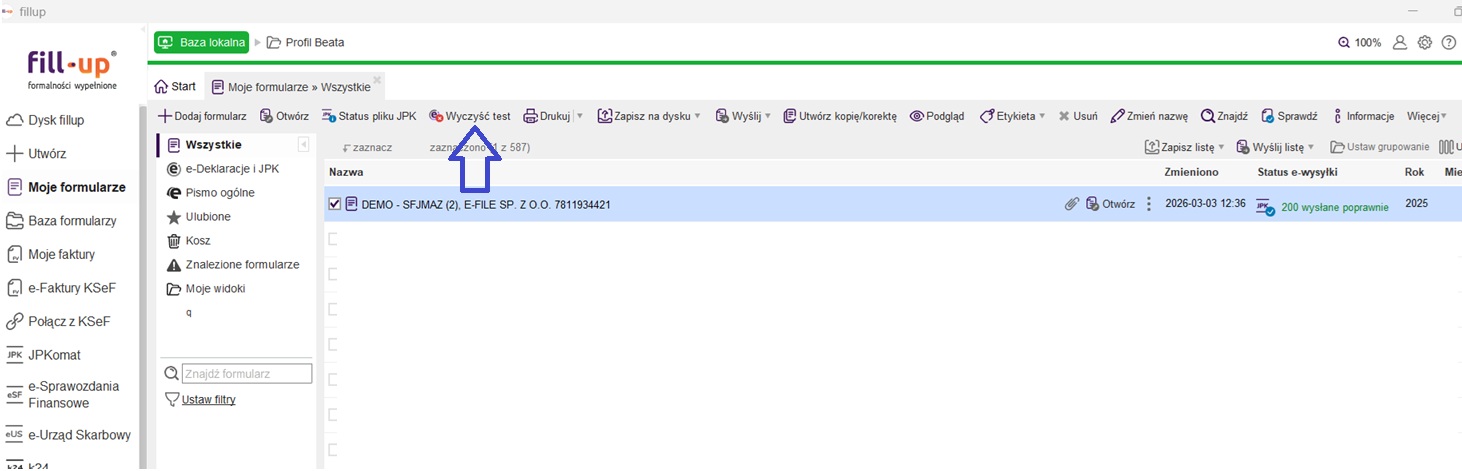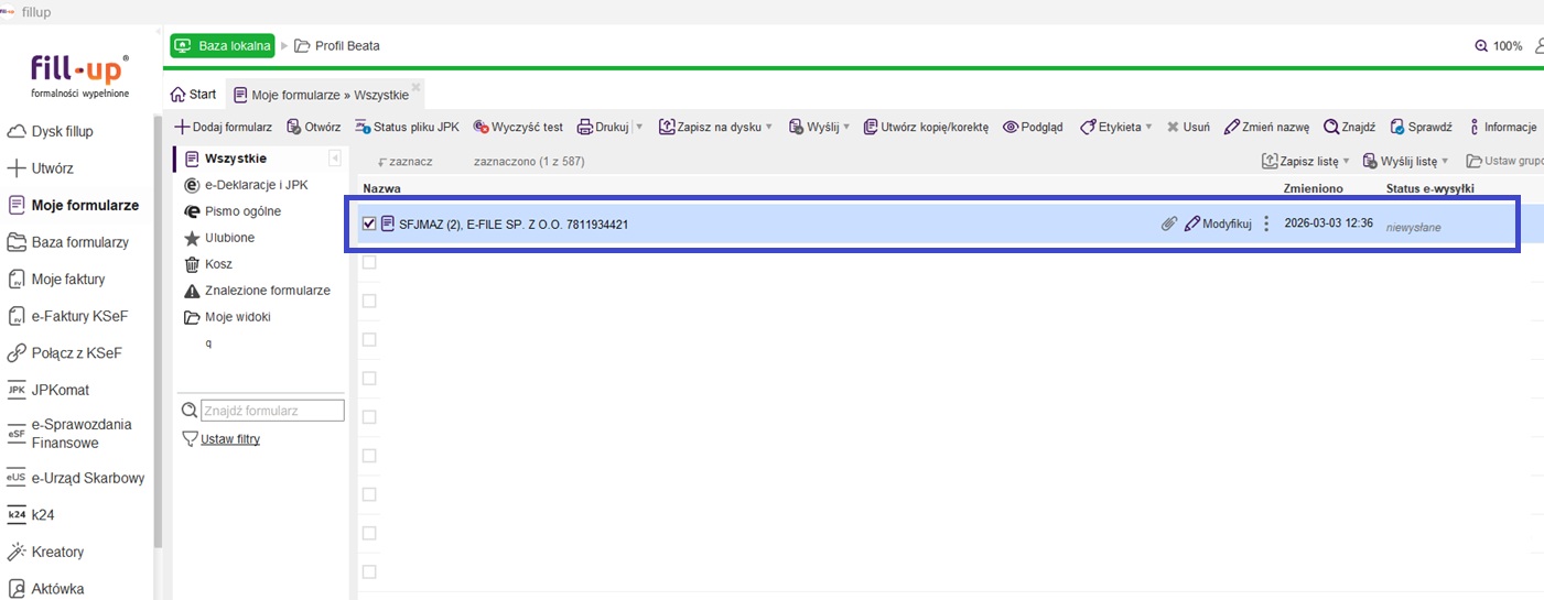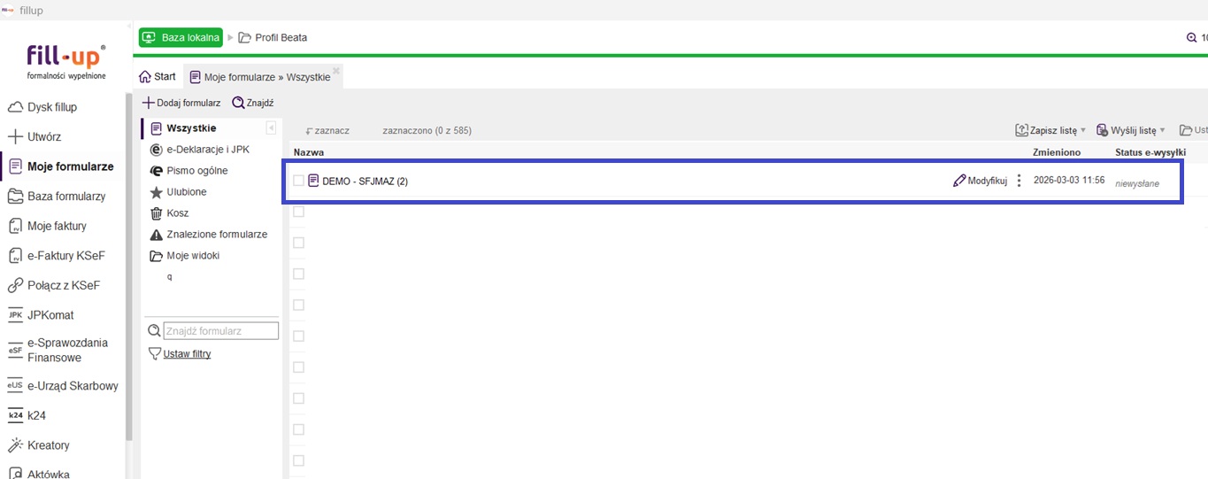 W zakładce Moje formularze zostanie zapisany jako DEMO - SFJMAZ (2).
