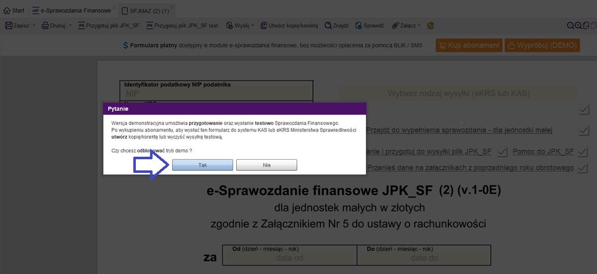 Otworzy się formularz sprawozdania finansowego z informacją, że jest to 'Wersja Demo'.