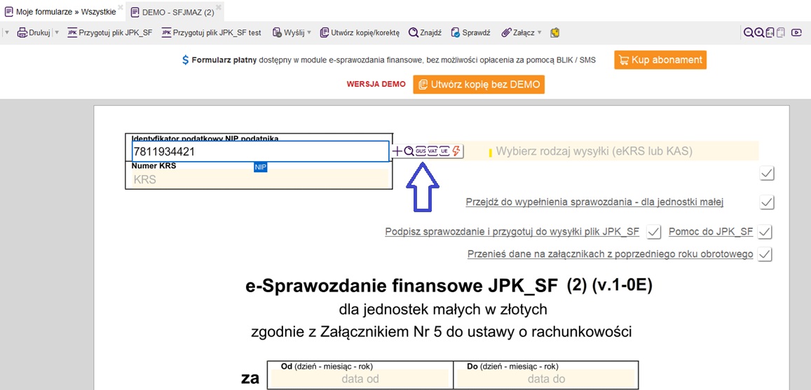 UWAGA: Pracując w wersji DEMO modułu e-SF możesz wprowadzać fikcyjne, testowe dane do formularzy. Możesz też przygotować już swoje docelowe sprawozdanie z rzeczywistymi danymi, a po zakupie abonamentu będzie można to sprawozdanie podpisać podpisami kwalifikowanymi lub przez profil zaufany i wysłać.