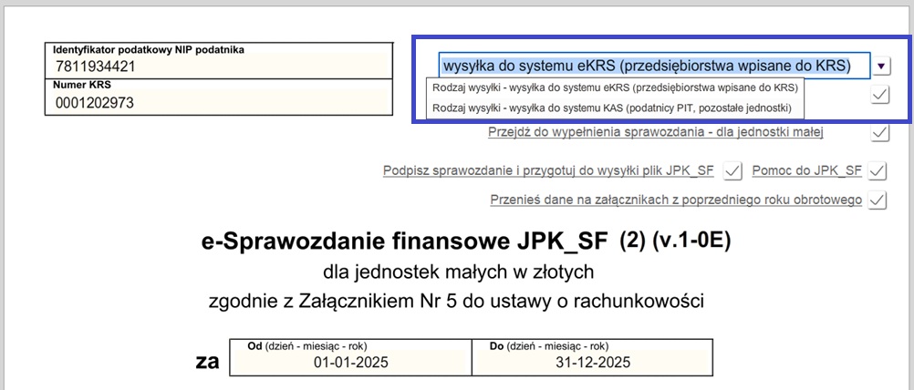 Wybierz rodzaj wysyłki - wysyłkę do systemu KAS lub do systemu eKRS.