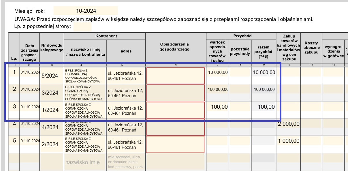 Natomiast w PKPiR widoczny jest on z wartością na jaką został wystawiony.