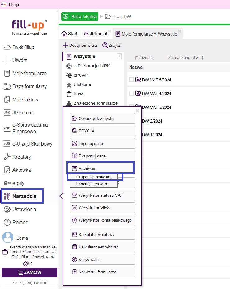 Możemy również wykonać archiwum (kopię zapasową) danych dowodów wewnętrznych.
