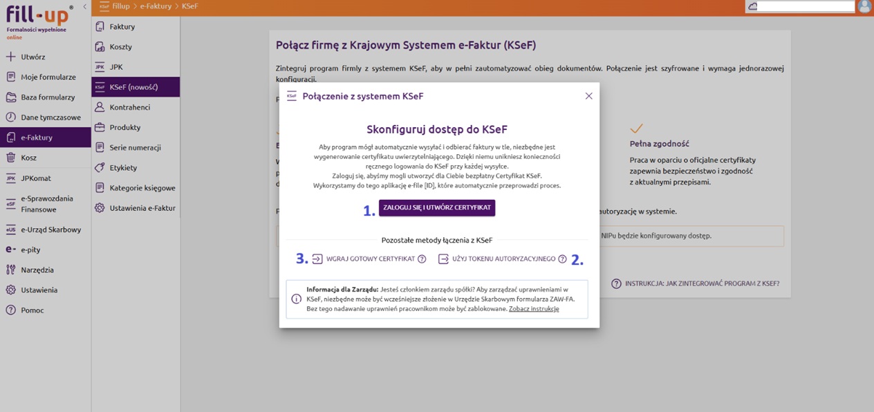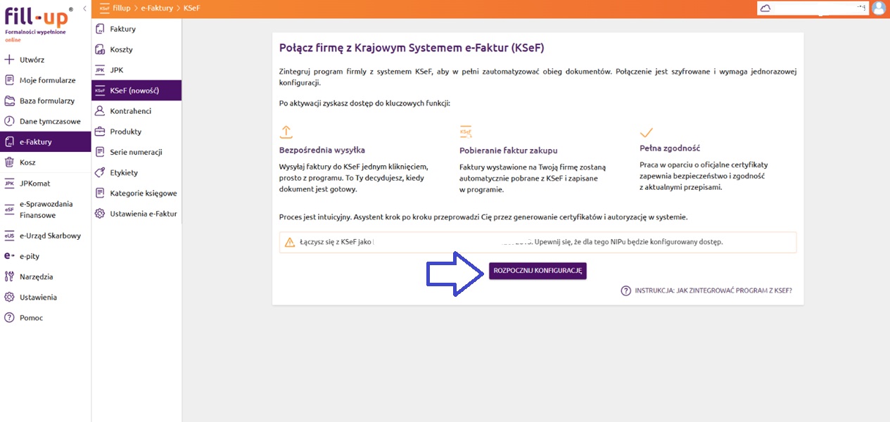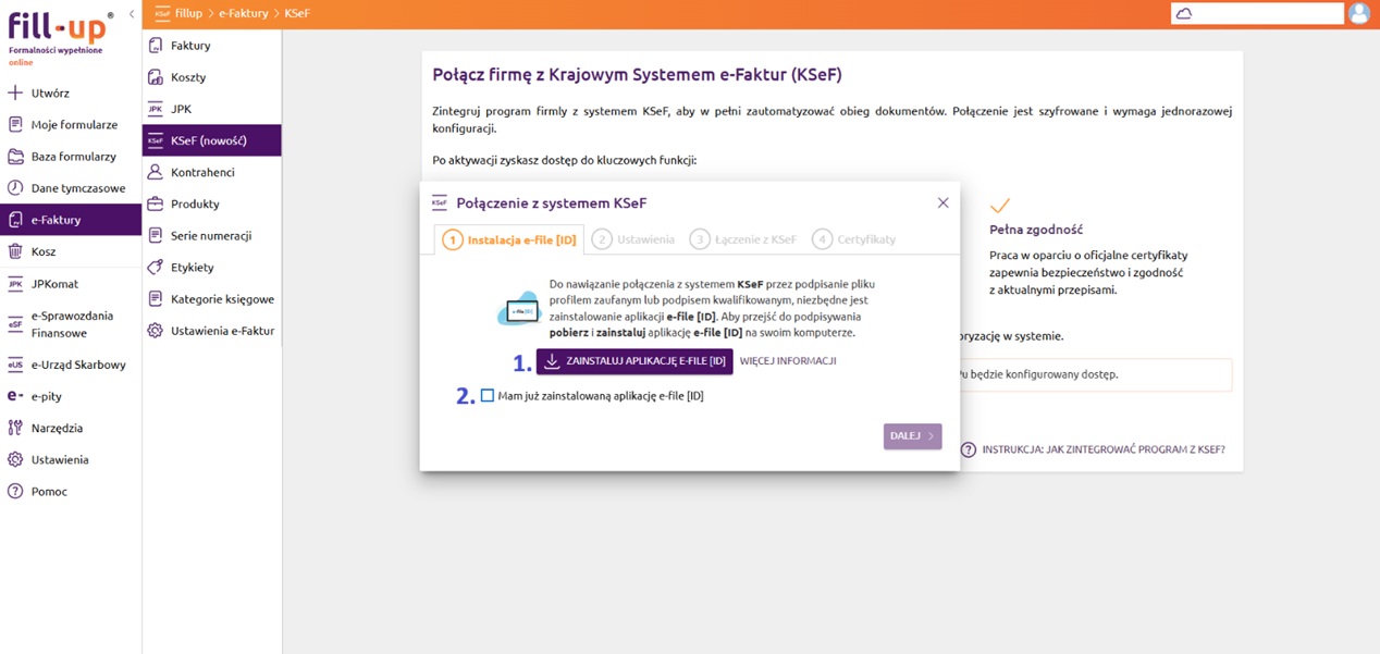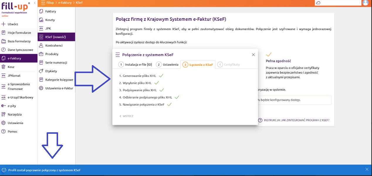 Po poprawnym zalogowaniu i podpisaniu pliku, zostaniemy przekierowani z powrotem do programu i otworzy nam się okno, w którym będzie widać, czy wszystkie kroki połączenia z KSeF przebiegły pomyślnie. Na dole strony będzie widoczny komunikat, że profil, na którym pracujemy w programie fillup, został połączony pomyślnie z systemem KSeF.