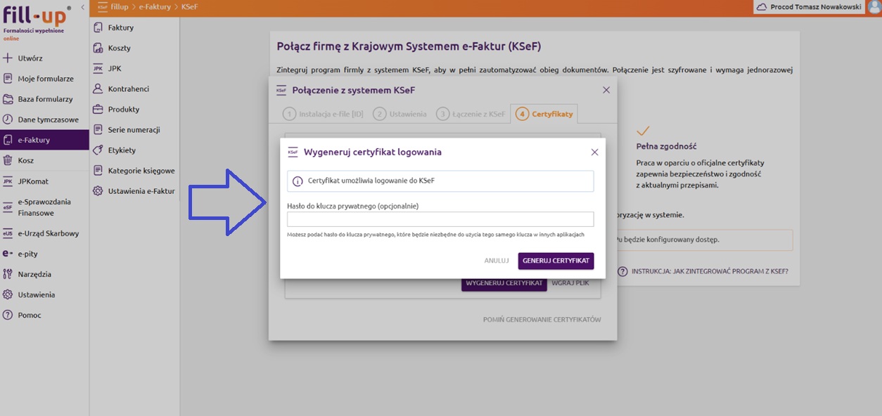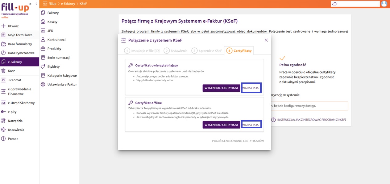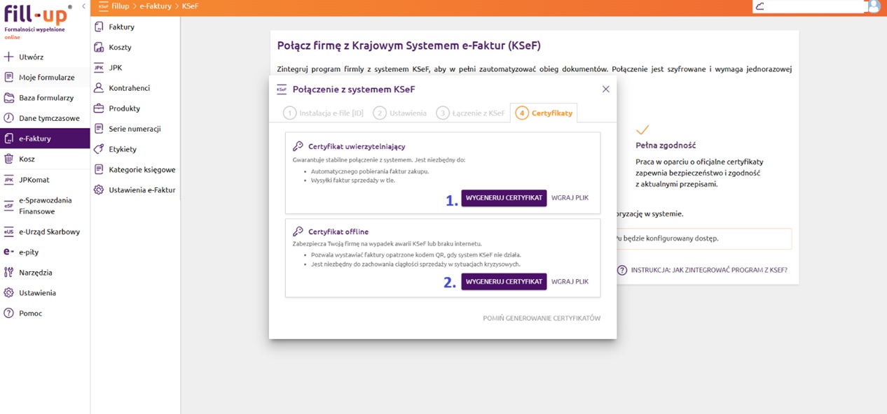 Następnie zostaniemy przekierowani do ostatniego, czwartego kroku, czyli wygenerowania certyfikatu uwierzytelniającego (do logowania się do KSeF) i certyfikatu do korzystania z systemu KSeF w trybie offline, dzięki czemu połączenie programu z KSeF będzie trwale zapamiętane.