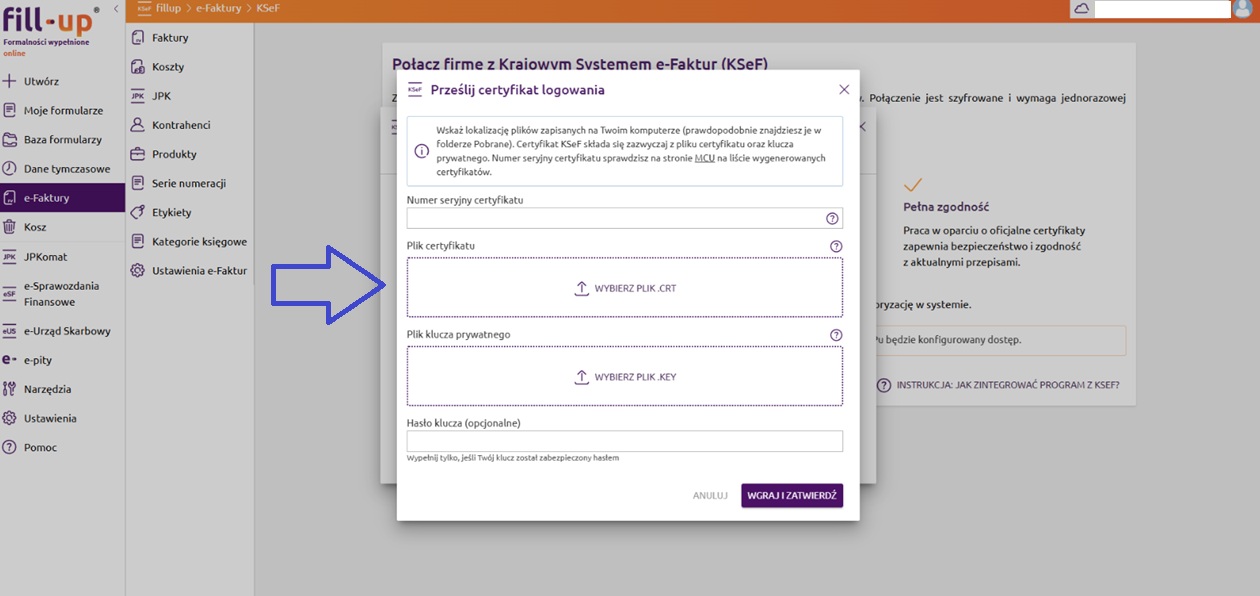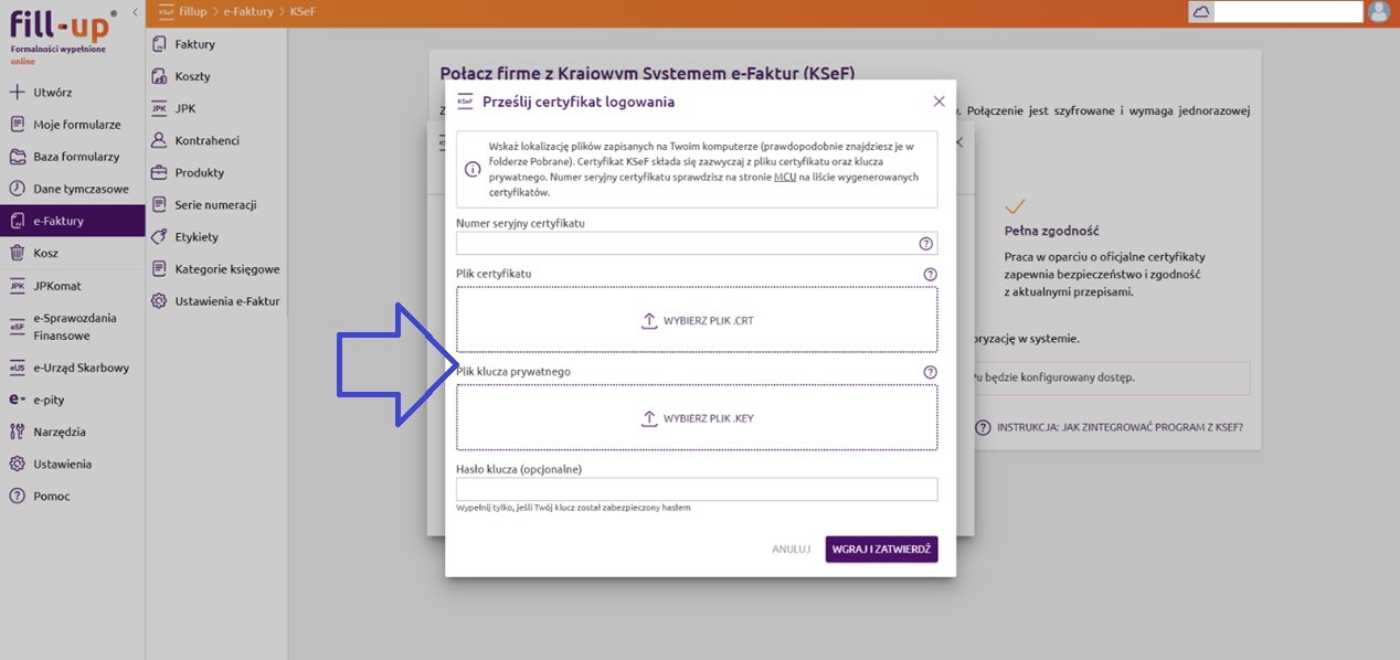 Pojawi się okno do wgrania certyfikatu oraz klucza prywatnego. Po wskazaniu plików, wybieramy opcję “Wgraj i zatwierdź”.