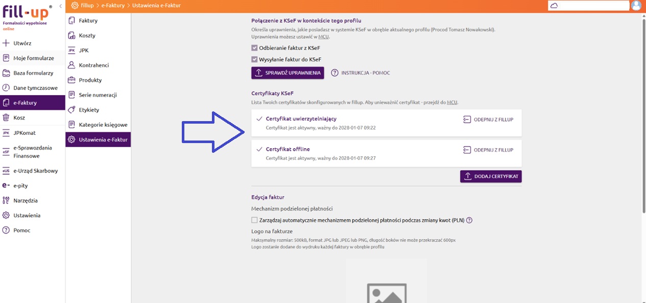 Dodatkowo w każdej chwili w ustawieniach e-Faktur również możemy zobaczyć aktywne wgrane certyfikaty.