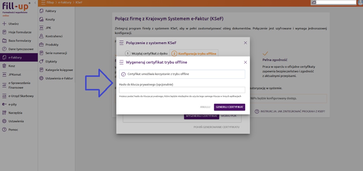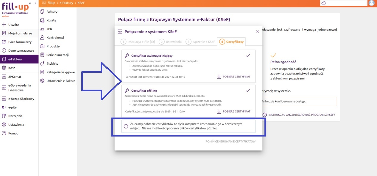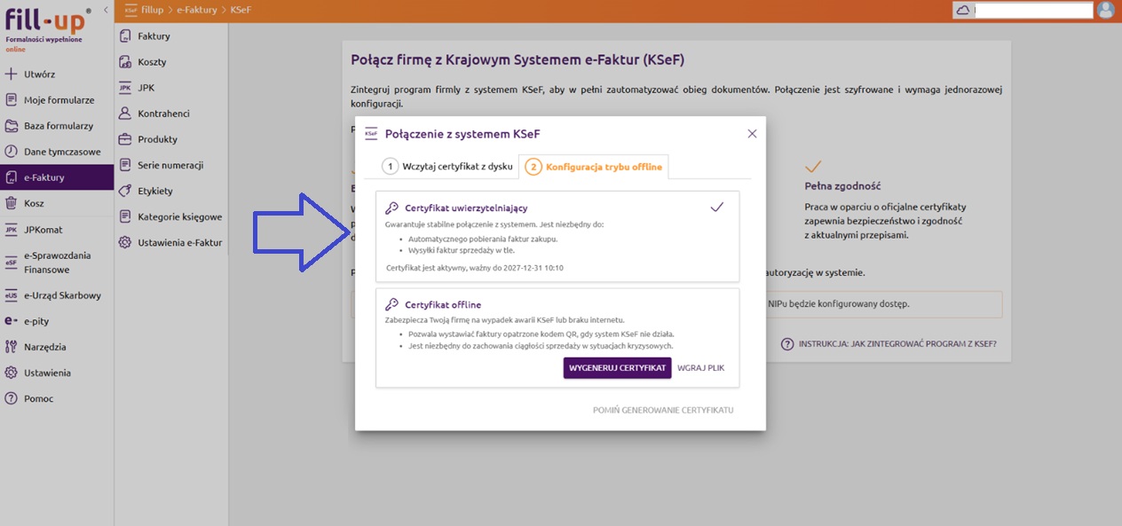 Zalecamy, aby po utworzeniu certyfikatu uwierzytelniającego (do logowania do KSeF), wygenerować od razu certyfikat offline, który pozwoli na wystawianie e-faktur z kodem QR podczas niedostępności systemu KSeF (2).