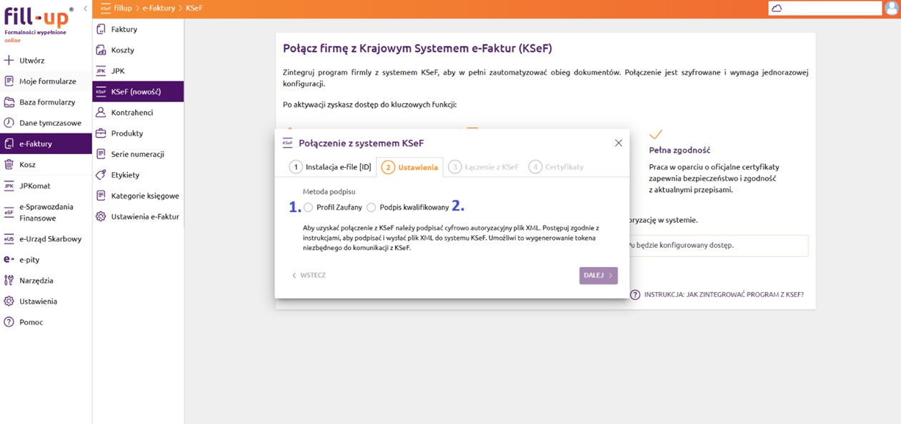 Następnie klikamy “Dalej”. Pojawi się drugi krok ‘Ustawienia’, w którym można będzie wybrać, czy chcemy autoryzować połączenie z KSeF przez swój Profil Zaufany (1), czy przez Podpis kwalifikowany (2).