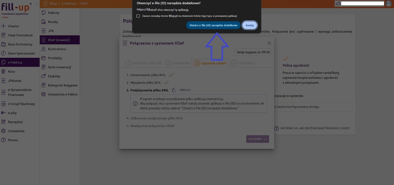 W trzecim kroku ’Łączenie z KSeF’ wyświetli się okno z zapytaniem, czy otworzyć e-file [ID]. Należy zezwolić na otwarcie klikając “Otwórz e-file [ID] narzędzia dodatkowe”.