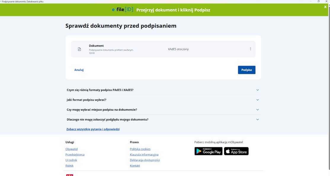 W przypadku wyboru podpisu Profilem Zaufanym wyświetli się okno, w którym należy sprawdzić i podpisać dokument.