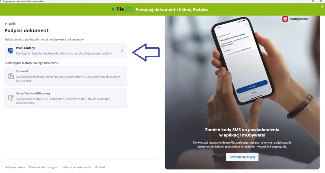 Po wybraniu odpowiedniej dla nas metody podpisu, klikamy “Dalej”.