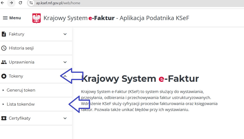 Jeżeli chcesz unieważnić token KSeF, tym samym cofając uprawnienia, które zostały nadane podczas jego generowania, należy po zalogowaniu się na stronie KSeF https://ap.ksef.mf.gov.pl/web/ przejść do menu ‘Tokeny’, a następnie wybrać ‘Listę tokenów’.