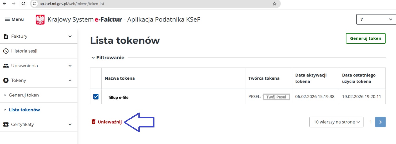 Po zaznaczeniu tokenu, który ma zostać unieważniony należy wybrać przycisk ‘Unieważnij’.