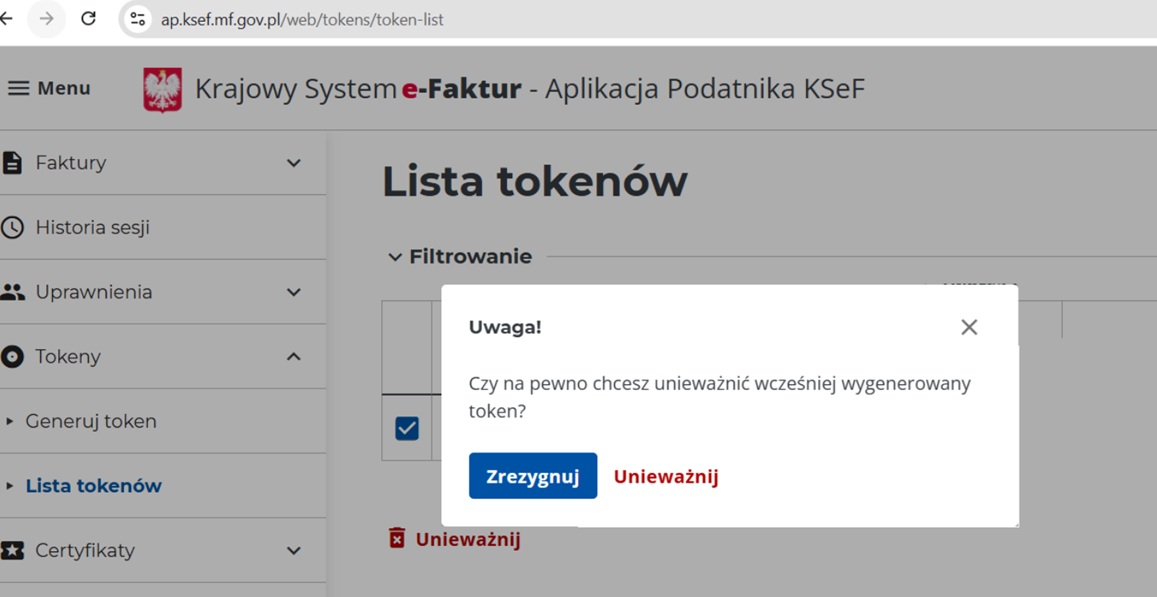 Pokaże się komunikat, w którym zostaniemy poproszeni o potwierdzenie unieważnienia tokena.