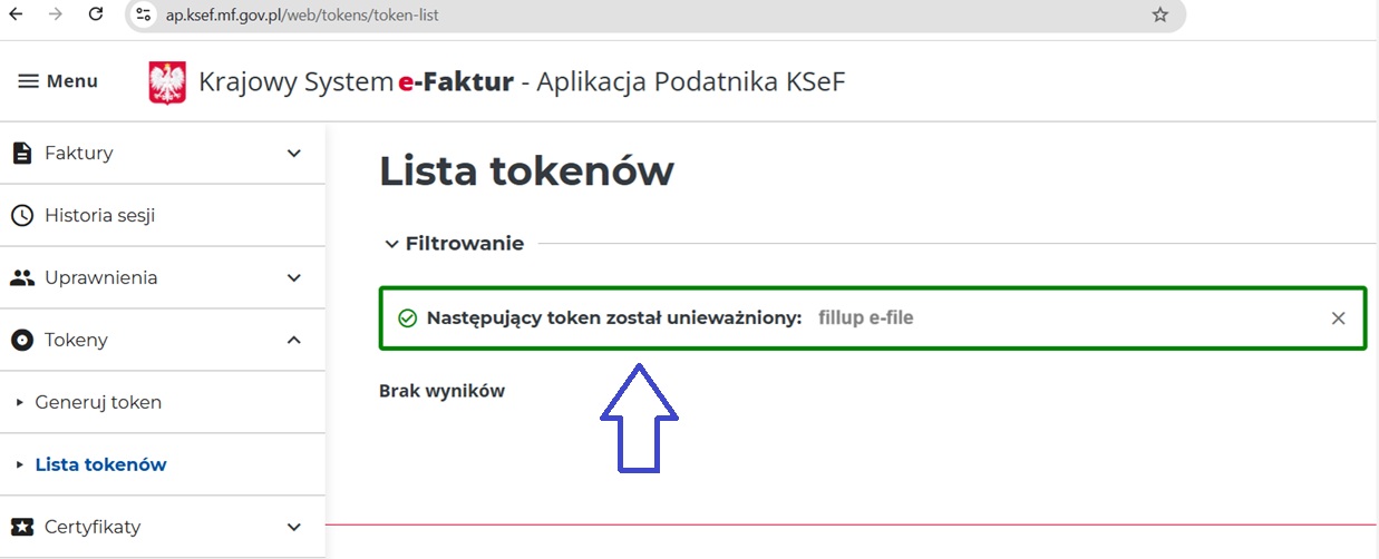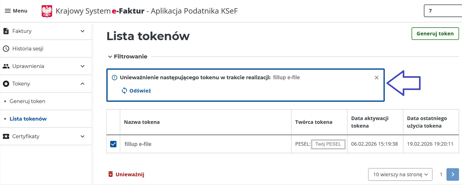 a po odświeżeniu okna przyciskiem ‘odśwież’ pokaże nam się informacja, że token został unieważniony.