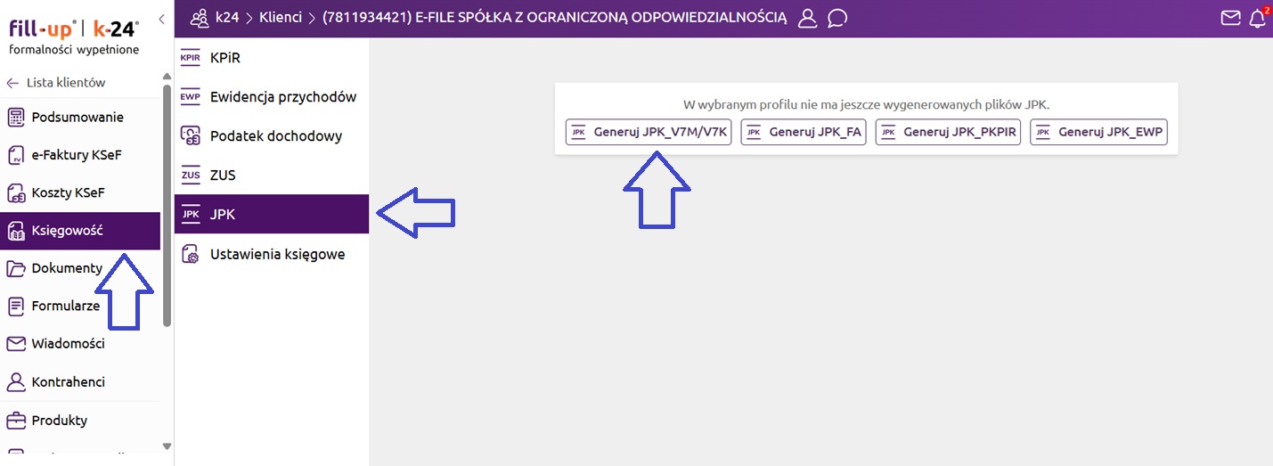Aplikacja k24 umożliwia wygenerowanie pliku JPK_V7M / JPK_V7K na podstawie dostępnych w programie faktur sprzedażowych oraz kosztowych (zarówno dostarczonych przez klienta, oraz wprowadzonych przez księgowego).
