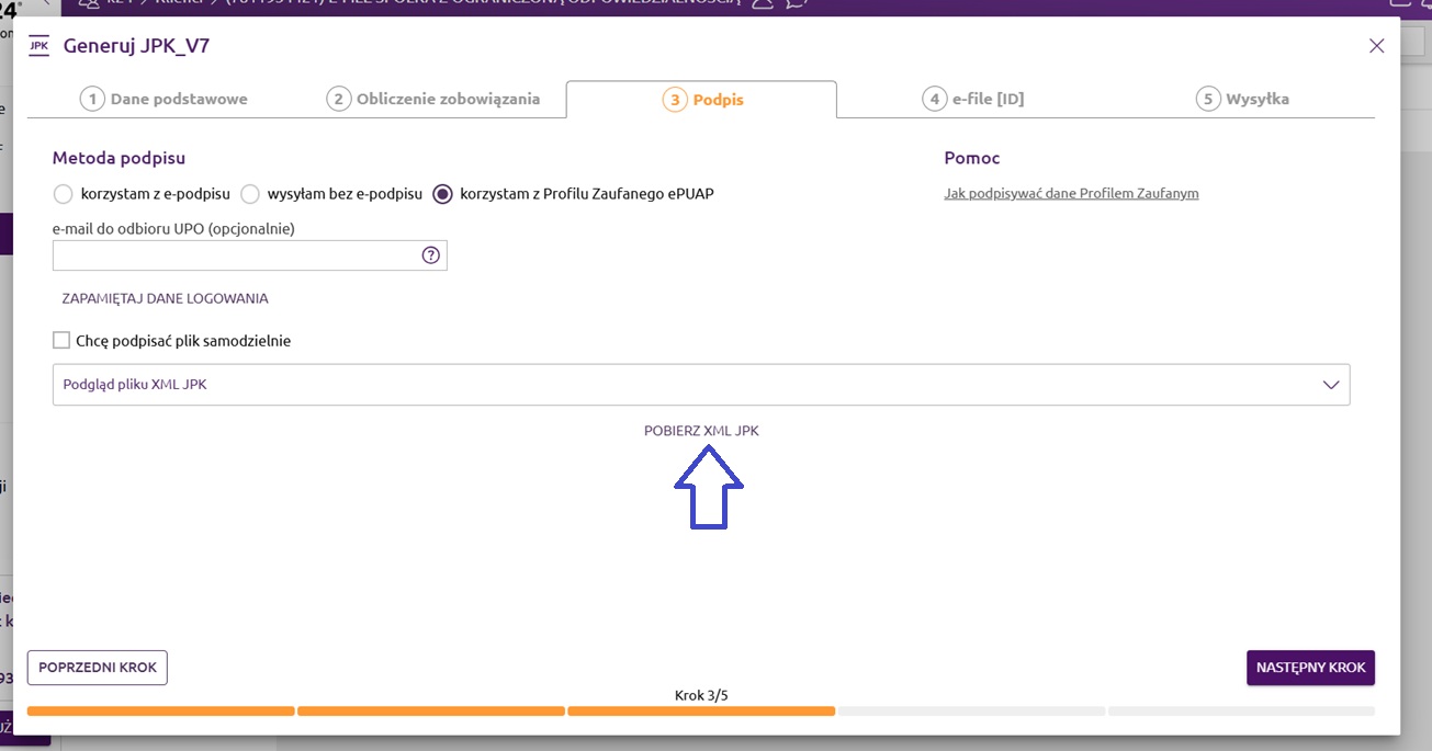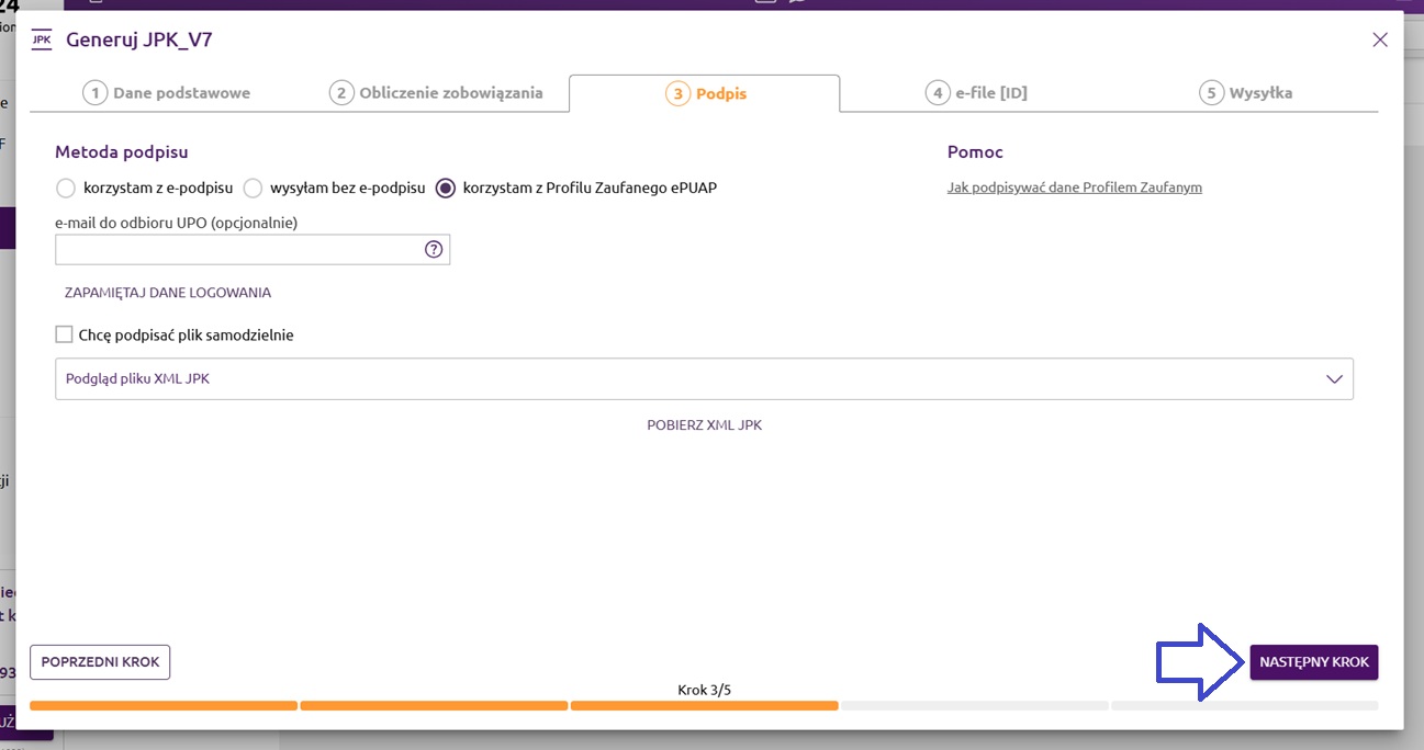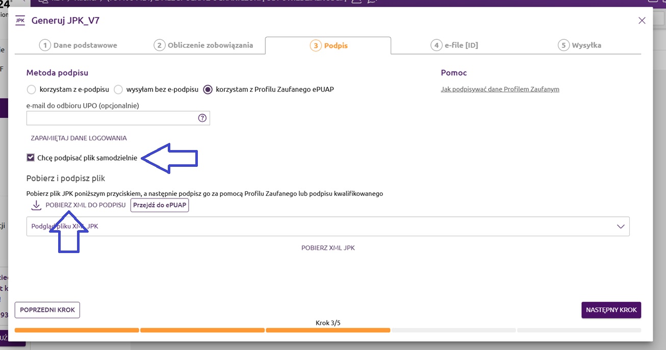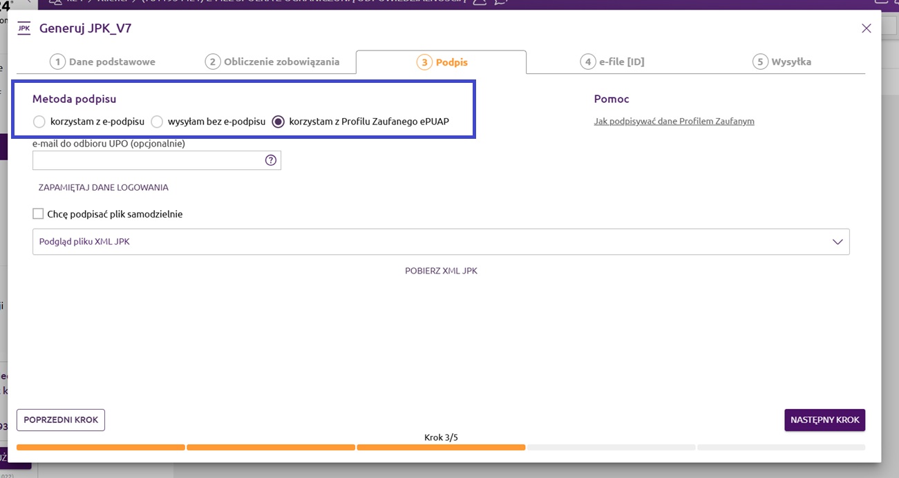 Trzeci krok dotyczy podpisywania pliku JPK. Mamy do wyboru trzy metody podpisu: