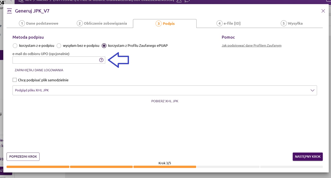 Poniżej możemy opcjonalnie podać adres e-mail do odbioru UPO.