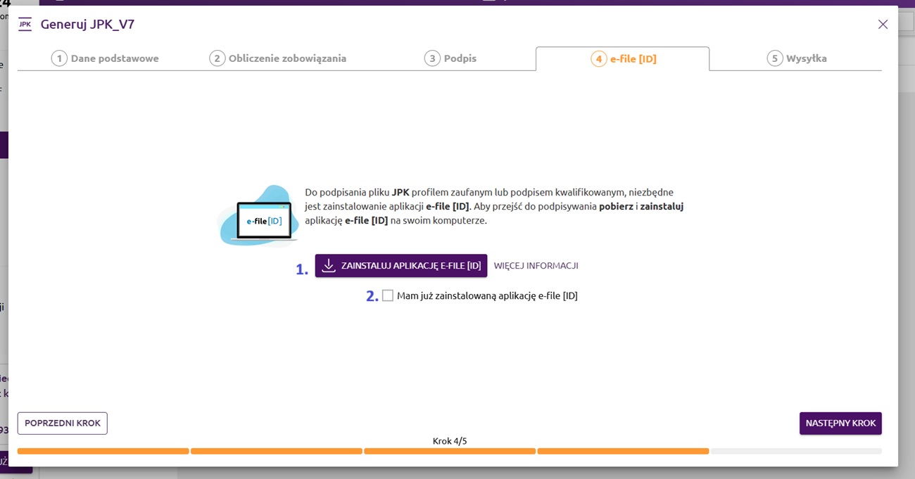 W kolejnym kroku kreatora JPK_V7 jeśli wybraliśmy metodę podpisu pliku za pomocą Profilu Zaufanego e-PUAP lub podpisu kwalifikowanego, trzeba będzie pobrać dodatkową aplikację e-file [ID] (możliwość pobrania tej aplikacji pokazuje się tylko na systemach Windows). Instalacja dodatkowej aplikacji e-file [ID] nie jest wymagana, jeśli wybrana została przez nas metoda ‘wysyłam bez e-podpisu’, tj. przy podpisywaniu za pomocą kwoty za poprzedni rok.
